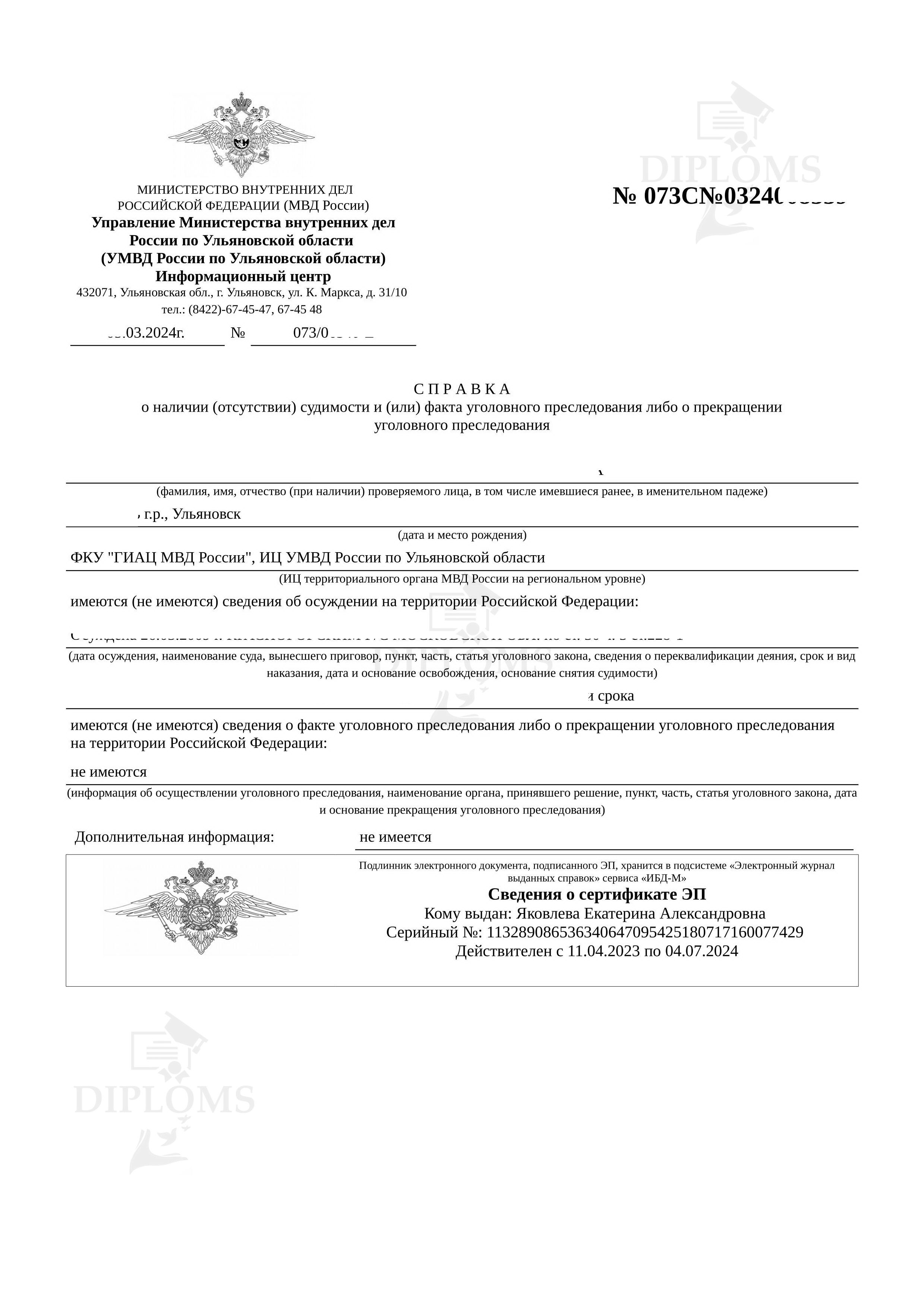 На что обратить внимание при покупке справки о несудимости? Очень многие организации делают справки только от определённых (популярных) регионов. Мы можем сделать справку о несудимости из любого региона/информационного центра. У нас есть образцы всех областей, республик, краев Российской Федерации. Эта база нарабатывалась годами. Также у нас самая большая база апостилей из всех регионов. Образцы справок о несудимости Из МВД (регионального информационного центра) Из МФЦ С портала Госуслуг С апостилем Апостиль нужен для предъявления документа за границами Российской Федерации. Мы делаем справки о несудимости от любых учреждений (МФЦ, МВД, с Госуслуг) и от любого региона Российской Федерации. От каких учреждений можно сделать справку о несудимости? Компания «Diploms» делает справки от МФЦ и от МВД. Также мы можем сделать электронный вариант, если вы заказываете справку в Интернете через портал Госуслуг. Это специальный PDF-файл, идентичный тому, что вы получаете через ГосУслуги. Что такое — чистая справка о несудимости? Чистая справка о несудимости — значит справка в которой стоят пометки — «НЕ ИМЕЮТСЯ, НЕ ИМЕЮТСЯ, НЕ ИМЕЕТСЯ». Это означает, что человек который получил данную справку не был судим никогда. Если вам нужна чистая справка — мы можем сделать это без дополнительных доплат. Как быстро купить справку о несудимости? Лучший способ быстро получить справку — заказать её на сайте Дипломс. Мы предлагаем сделать справку о несудимости без личного присутствия в самые сжатые сроки. От вас нужна только заявка в представленной форме заказа. Как только мы получим ее, мы свяжемся с вами в рабочее время, обсудим все детали и отдадим заказ в работу. |